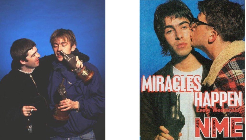 Por su parte Oasis se creó en 1991, con Noel Gallagher y su hermano pequeño Liam al frente de la banda. Los dos cantaban, pero además, Noel tocaba la guitarra junto con Paul Arthurs. Paul “Guigsy” McGuigan tocaba el bajo y Tony McCarroll la batería. Esta formación fue cambiando a lo largo de los años, siempre liderados por los hermanos Gallagher. Desde su debut en 1993, Oasis fue el grupo protagonista, notablemente publicaron (What’s The Story) Morning Glory? que en una semana consiguió vender 350.000 copias en Inglaterra, algo que no pasaba desde que Michael Jackson publicó su álbum Bad. Además, en este álbum está la canción Wonderwall, que en 2005 se declaró la mejor canción inglesa según los oyentes de Radio X. Después de 1997 empezaron a ser algo más vagos con su música y sacaron álbumes con menos éxito y recopilaciones. Noel y Liam tenían varios problemas: en una ocasión Noel donó el regalo de la tienda de Liam a una tienda de ropa de segunda mano. Durante un concierto en que, a causa de las drogas, el grupo no estaba dando una buena actuación, Liam le tiro una pandereta a Noel. En otro concierto en que Liam no podía cantar, Noel se dedicó a hacer comentarios en los que hacía ver que Liam no era indispensable para la banda, e incluso Noel pegó a Liam con un bate de cricket después de que este llegara borracho a la grabación de un álbum. La tensión entre hermanos hizo que se separaran antes de un concierto en Paris en 2009, después de una discusión en la que Liam rompió la guitarra del Noel.