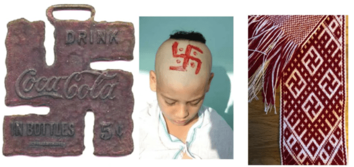 Esvásticas utilizadas en un anuncio de Coca-Cola de 1925, como parte de la ceremonia de iniciación hindú del upanayana y como decoración de cinturones etnográficos letones.