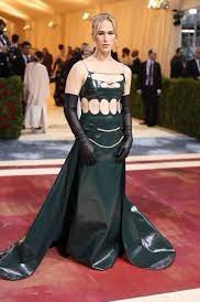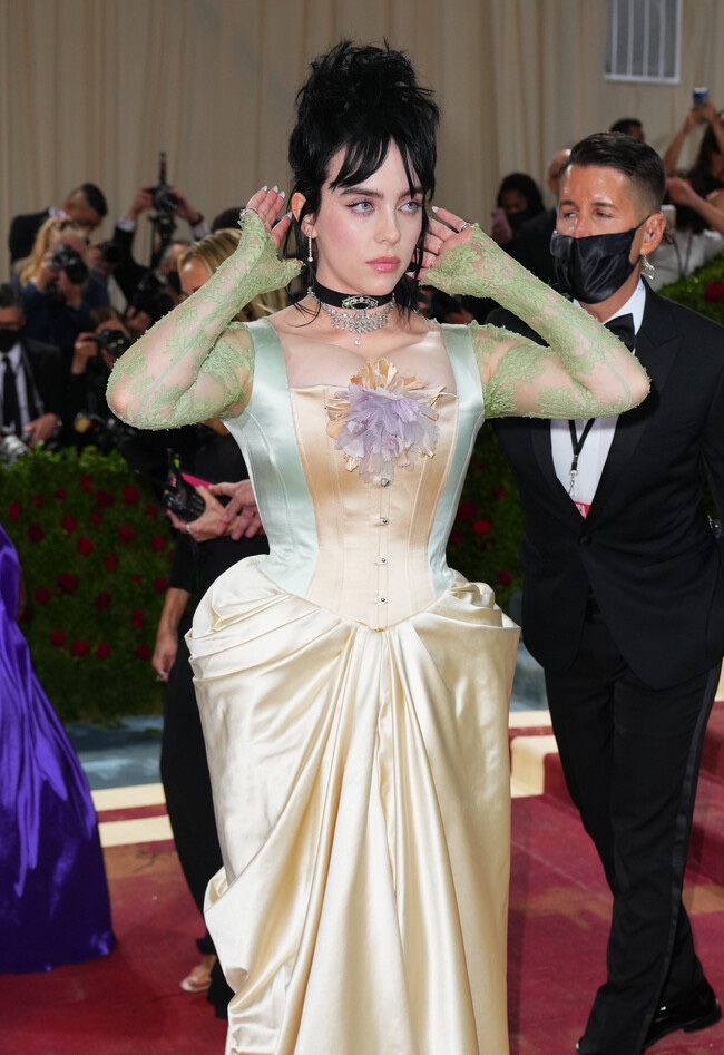 Billie eilish. La única en esta lista que siguió la temática lo que le salva un poco, lo que nos hace preguntar si es mejor un outfit feo con la temática o uno bonito sin. Va muy parecido a la imagen general que se esperaba de todos pero su falda podría parecerse a un mantel mal doblado, lleva una flor enorme en el pecho y ha combinado la ropa del siglo XIX con un choker negro tipo gótico. La redecilla verde tampoco ayuda el caso, pero sobretodo es decepción porque en su gala 2021 iba espectacular.