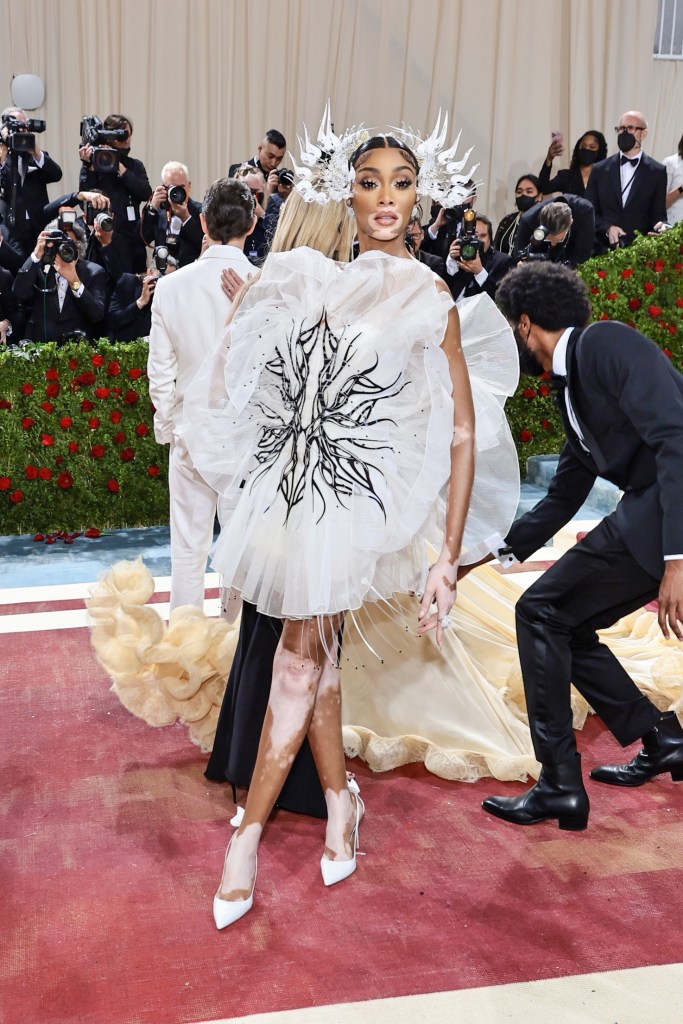 Winnie Harlow. No se muy bien como describir el “vestido” que lleva la modelo con vitiligo ya que es como una flor enorme que le hace parecer una bola. Ninguna parte de todo lo que lleva tiene mucho sentido pero la corona de cuernos que se parece a la de la hermana mala de Thor se lleva el premio para el peor accesorio.