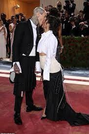 Kourtney kardashian. Para su primera gala, kourtney decidió que la temática no era importante, lo que admitió en una entrevista. La mezcla de blanco con beige, la camisa blanca corta, la falda de dos colores, la tela de la parte negra de la falda que parece ser de traje, el hecho que se vean las costuras a propósito, hace todo para una combinación bastante horrible. La intención creo que es que se parezca a un traje de hombre recosido en otra forma para ir a conjunto con su futuro marido que también iba bastante horrible ya que llevaba una falda encima de sus pantalones.