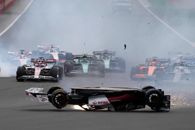 La carrera se detuvo en la primera vuelta debido a un espantoso accidente de varios coches que hizo que el coche de Guanyu Zhou se estrellara contra una valla. Fue atendido en el centro médico y el piloto de Williams Alexander Albon fue trasladado a un hospital para una evaluación después de golpear un muro en el mismo incidente.