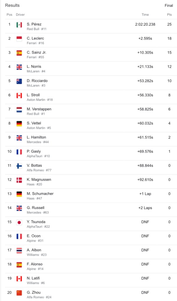 Por lo general, una carrera muy accidentada con varios Safety y Virtual Safety Cars. Los Red Bull demostrando que lo van a ganar todo, los Ferrari con una carrera a la que aspiraban a más y Mercedes con una carrera para olvidar. Mclaren y Aston Martin se llevan un gran botín de puntos con los 4 coches puntuando. Los Haas decepcionados después de la gran salida que habían hecho, pero que acabó con Schumacher y Magnussen fuera de los puntos. Los dos Alpine fuera, al igual que los dos Williams y el chino Zhou.