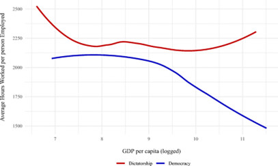 Datos que muestran la diferencia de desarrollo entre democracia y absolutismo son por ejemplo la cantidad de horas trabajadas por persona, que afectan directamente a el “output” económico del país, lo que afecta su desarrollo económico directamente.