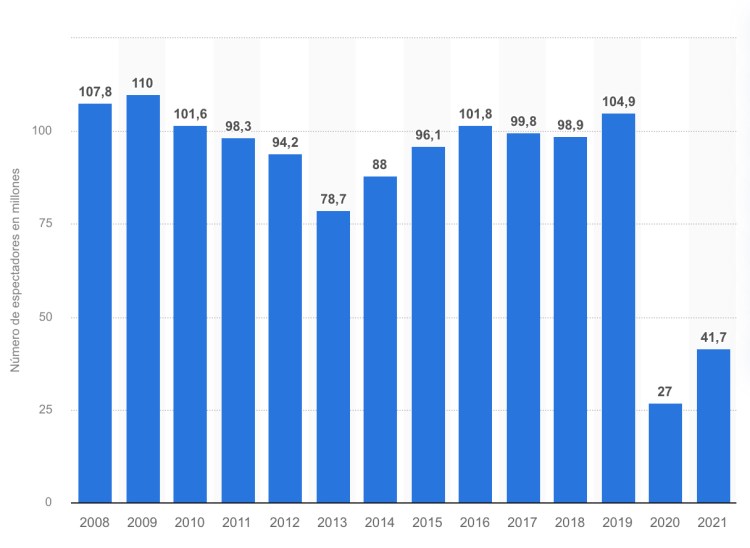 En esta imagen se puede apreciar la cantidad de gente que ha asistido a cines españoles en los últimos 13 años. Durante el 2020 y el 2021 el número de personas ha disminuido a niveles estratosféricos. Pasando de que la menor cifra de gente que fue al cine sea 78,7 a que sea de 27.