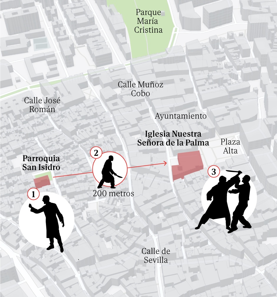 Sobre las 18h30, el miércoles 25 de enero de 2023, un hombre de 25 años, Yasine Kanjaa, entró en la parroquia de San Isidro, Algeciras (Cádiz), donde estuvo discutiendo de manera muy violenta con una feligresa, en razón de sus creencias. Gritó: “ Tu fé no es la auténtica” y se marchó amenazándola e insultándola. Alrededor de las 19h30, regresó con un machete e hizo un corte en el cuello al párroco, Antonio Rodríguez (que fue operado de inmediato por las graves heridas pero ya se encuentra estable). Aquellos que intentaron impedir el ataque resultaron heridos.