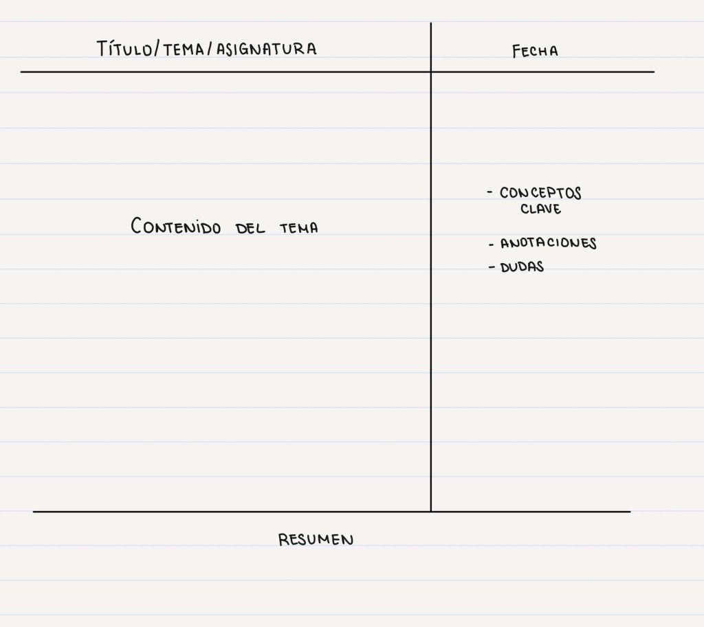 El método Cornell es recomendado para tomar los apuntes diarios en clase y más tarde hacer la parte de las ideas principales y del resumen. De esta manera se revisan los contenidos mucho más fácilmente.