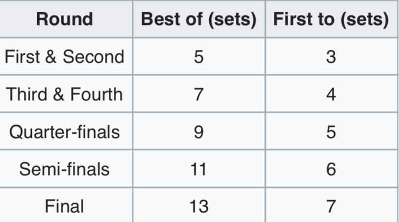 ¿Cual es el formato del torneo? Se juega un 501, es decir, los jugadores tienen que puntuar 501 puntos antes que su oponente ACABANDO CON UN DOBLE, para poder completar el juego del set….. como el tenis. Aunque no todos los partidos se juegan al mismo número de sets, depende de la ronda…… aquí se muestra una tabla que lo representa: